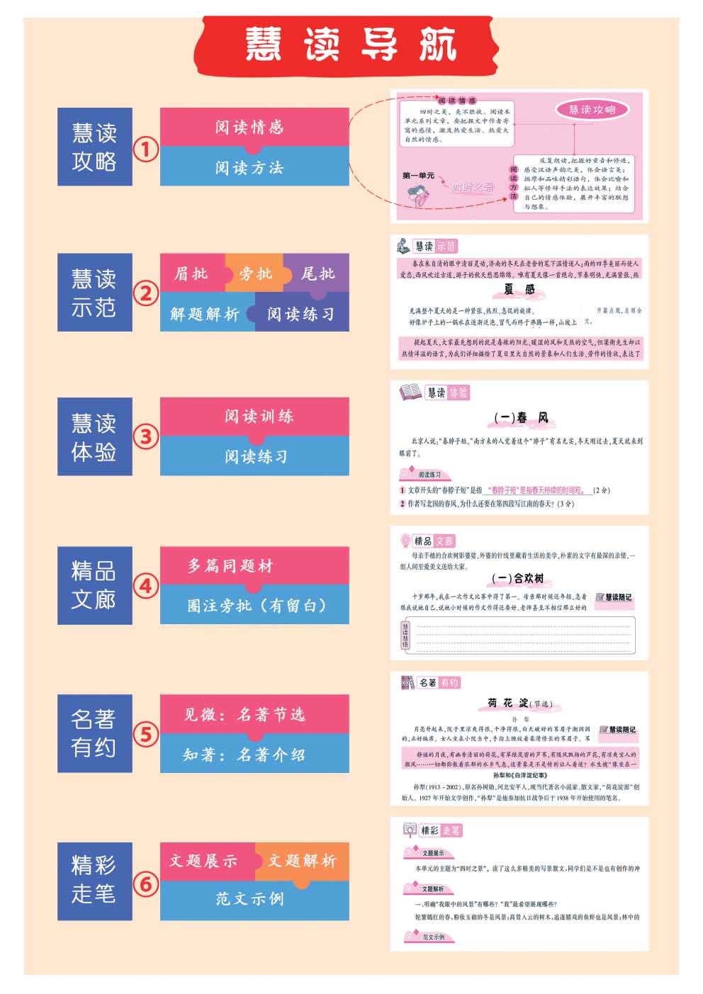 《隨堂慧讀》依靠教材的體例,首創(chuàng)“六位一體”閱讀法:①慧讀攻略→ ②慧讀示范 → ③慧讀體驗(yàn) → ④精品文廊 → ⑤名著有約 →⑥ 精彩走筆。